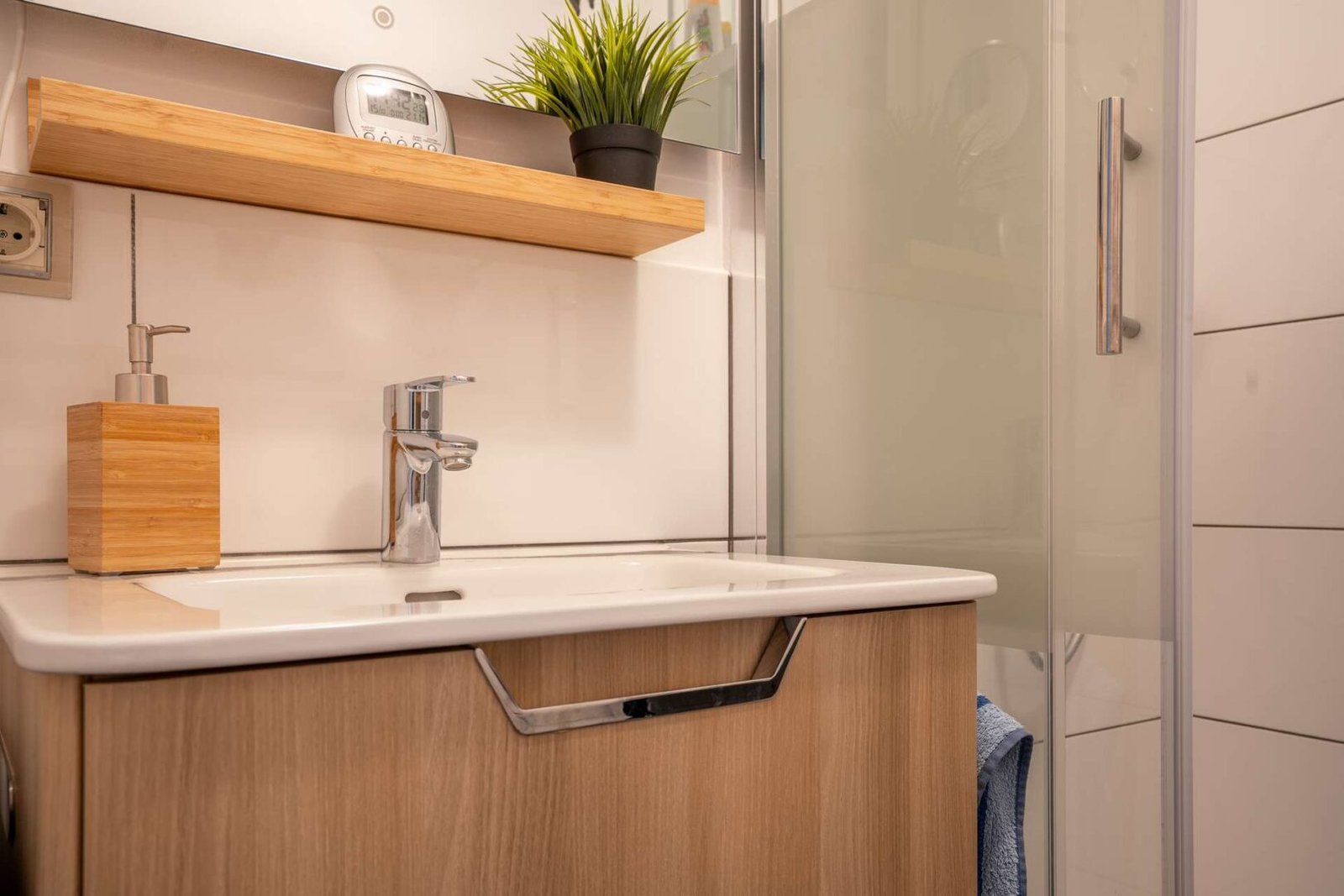 Das Badezimmer verfügt über eine Dusche und einen Waschmaschinenanschluss, das WC ist separat angelegt. Beide Räume wurden im Zuge der Modernisierung 2014 erneuert. Das Kinder- oder Arbeitszimmer hat ebenfalls Zugang zum Balkon.