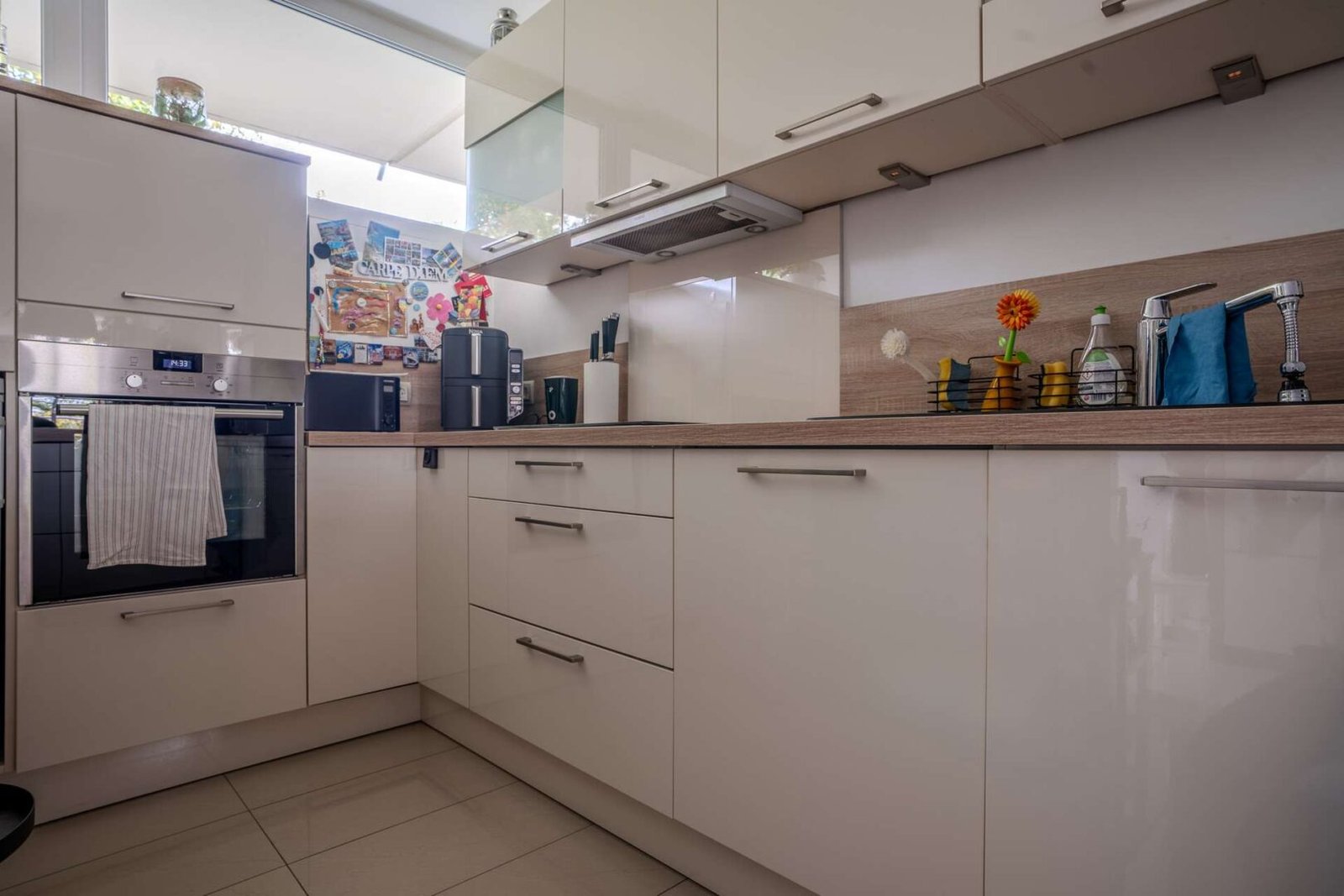Beim Betreten öffnet sich ein heller Wohn- und Essbereich mit offener Küche. Der Raum ist länglich geschnitten und vermittelt durch große Fensterflächen und den Balkonzugang ein großzügiges Raumgefühl. Die offene Küche ist harmonisch in den Wohnbereich integriert und Teil des Angebots.